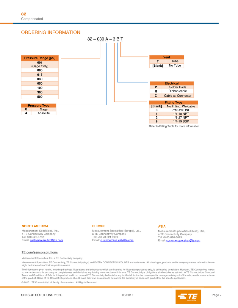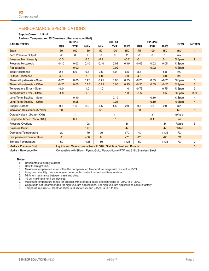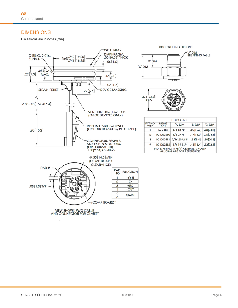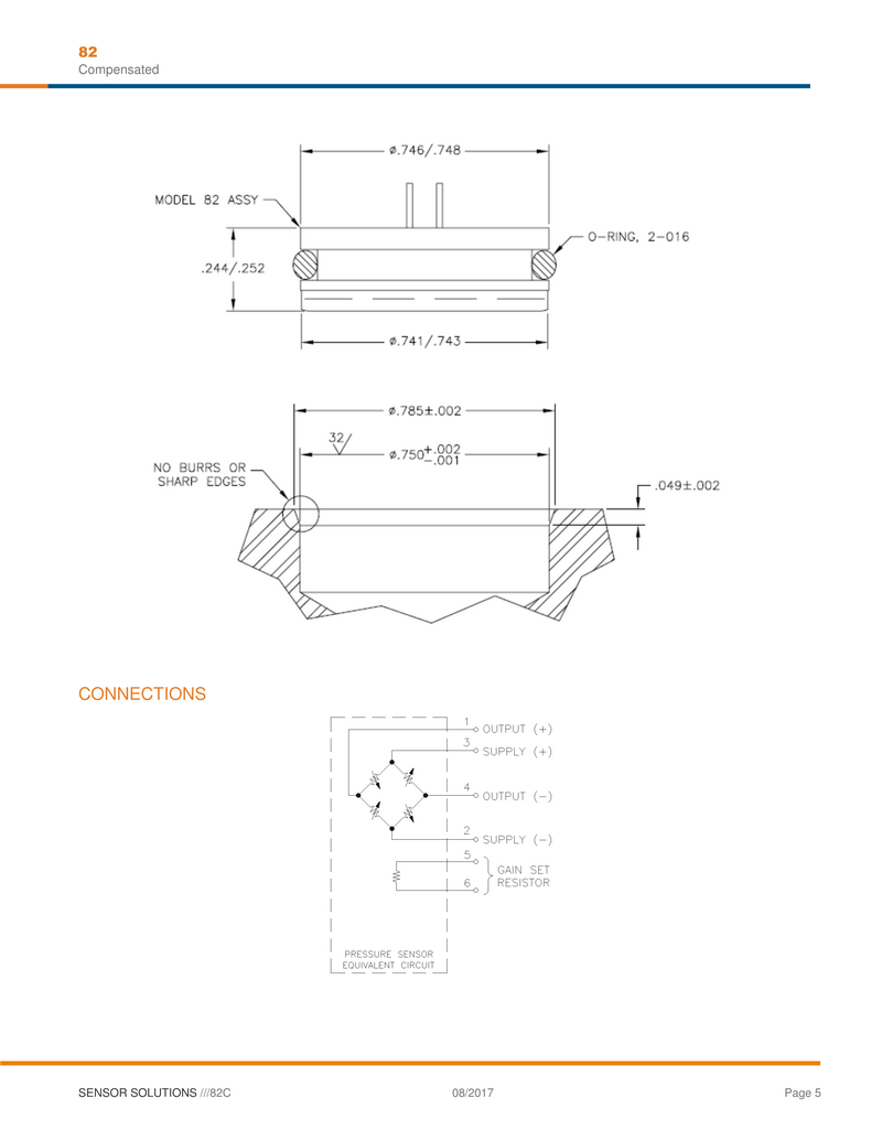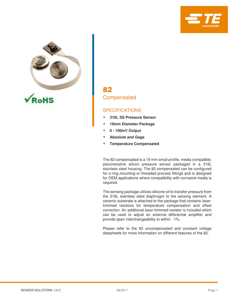 82 补偿型是一款直径 19 mm、外形小巧、介质兼容、压阻式硅压力传感器,采用 316L 不锈钢外壳封装,O 型环安装或或螺纹过程连接,专用于需要与腐蚀介质兼容的原始设备制造商应用。 传感器利用硅油将压力从 316L 不锈钢隔离膜传递到感应元件上。封装件上附有一个陶瓷基板,其中包含一个激光修正电阻以对传感器进行温度补偿和偏移校正。此外还包含另外一个激光修正电阻,可用于调整外部差分放大器及提供 ±1% 的互换量程范围。要详细了解 82 的其他功能, 请参阅 82 无补偿和恒压型数据手册。